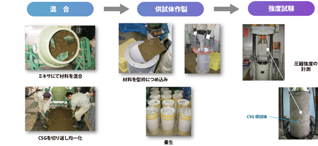 しかし、CSGの実用化は容易なことではありませんでした。治水・防災施設を建設する際の材料として活用するためには、十分な品質管理手法を確立する必要があったからです。この課題を解決するため、当社で蓄積してきたダムの計画・調査・設計・施工計画・施工管理等の知見を活かし、次の手順により大型供試体試験※を実施し、得られた密度・強度が施工現場と同等の品質、すなわち大型供試体試験による品質管理が可能であることを証明しました。