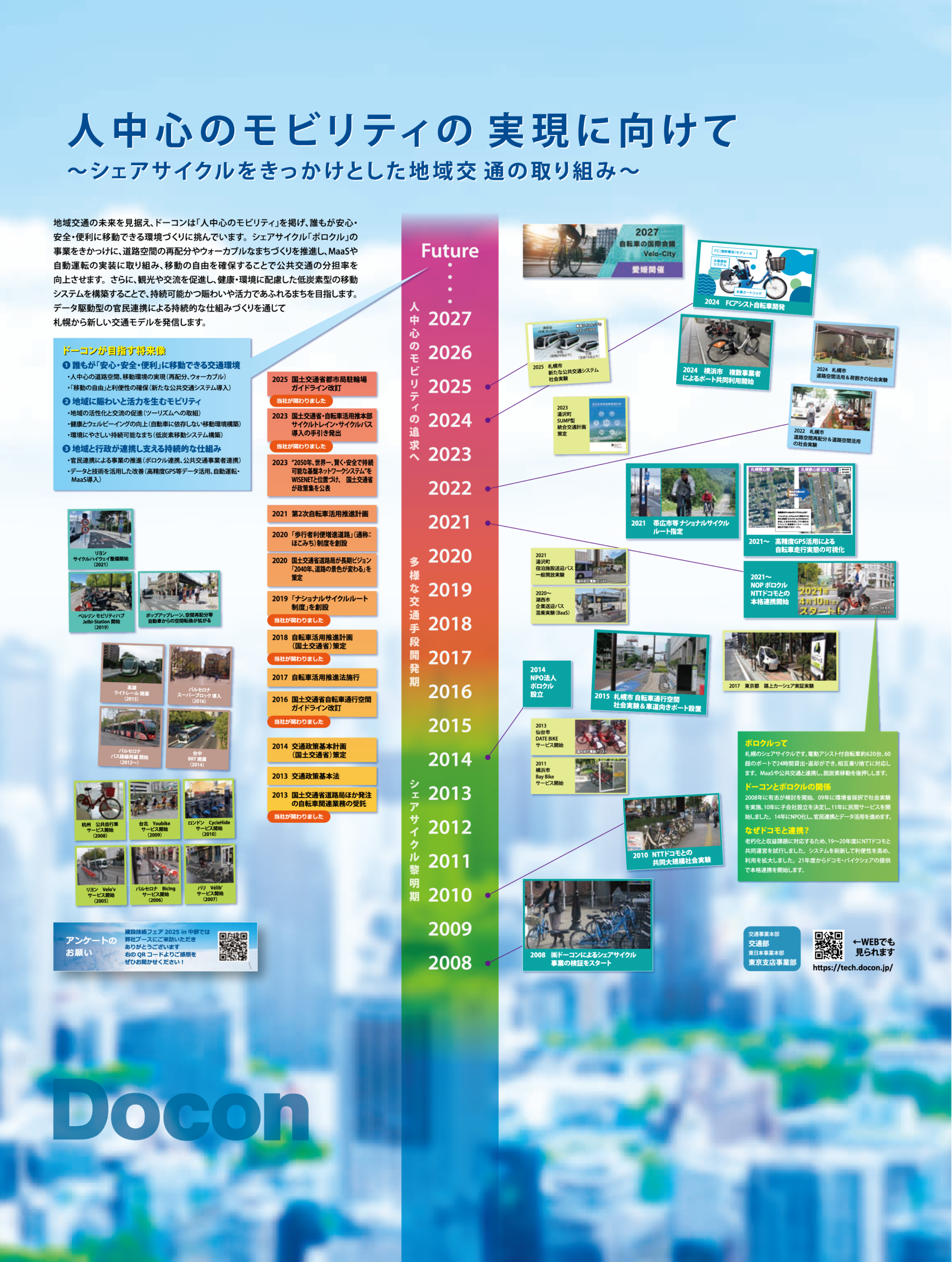 地域交通の未来を見据え、ドーコンは「人中心のモビリティ」を掲げ、誰もが安心・安全・便利に移動できる環境づくりに挑んでいます。シェアサイクル「ポロクル」の事業をきかっけに、道路空間の再配分やウォーカブルなまちづくりを推進し、MaaSや自動運転の実装に取り組み、移動の自由を確保することで公共交通の分担率を向上させます。さらに、観光や交流を促進し、健康・環境に配慮した低炭素型の移動システムを構築することで、持続可能かつ賑わいや活力であふれるまちを目指します。データ駆動型の官民連携による持続的な仕組みづくりを通じ、札幌から新しい交通モデルを発信します。